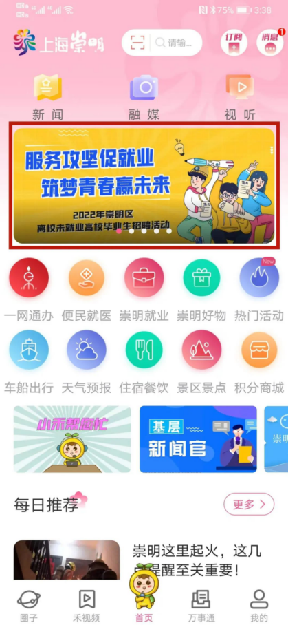 1.打开“上海崇明”App,点击下图红色边框的窗口