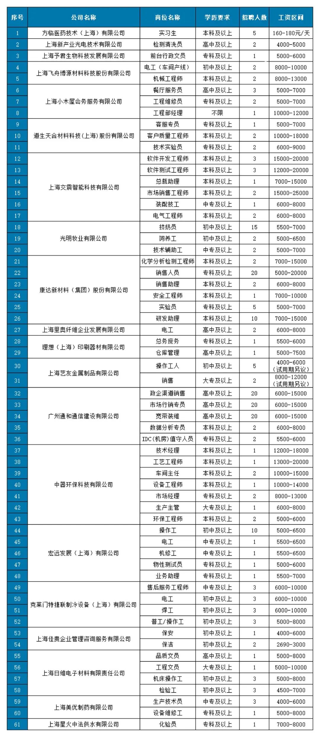 提供61个岗位,招聘221人