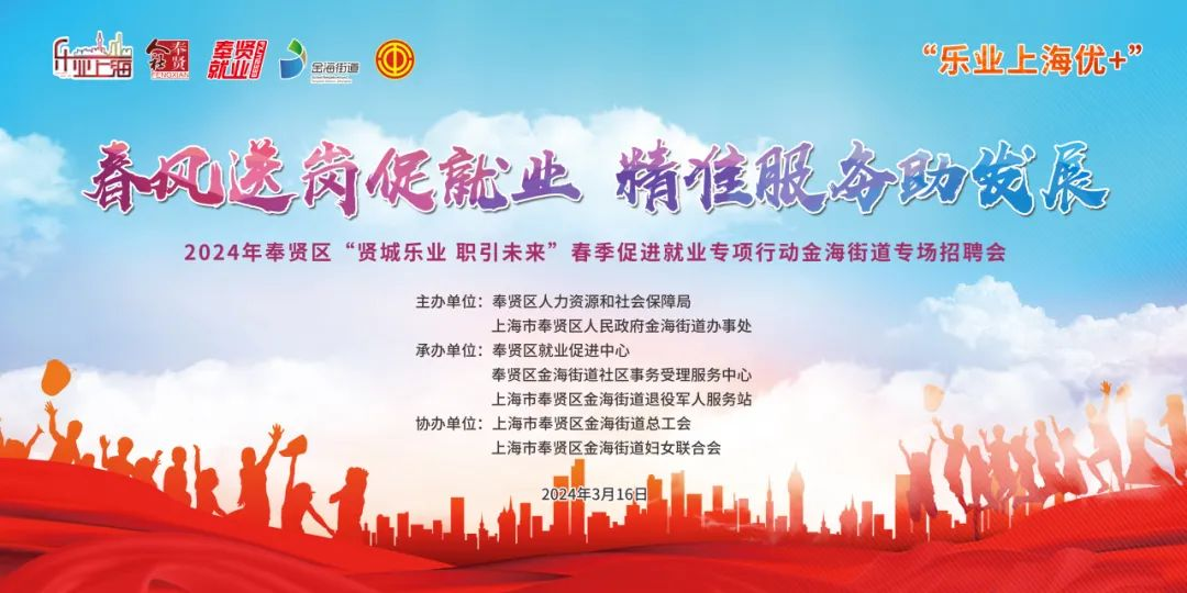 为促进高校毕业生、就业困难人员、外来务工人员等群体高质量充分就业,不断提升公共就业服务能效,金海街道将于2024年3月16日(周六)13:00举办“乐业上海优+”——“春风送岗促就业,精准服务助发展”2024年奉贤区“贤城乐业 职引未来”春季促进就业专项行动金海街道专场招聘会!