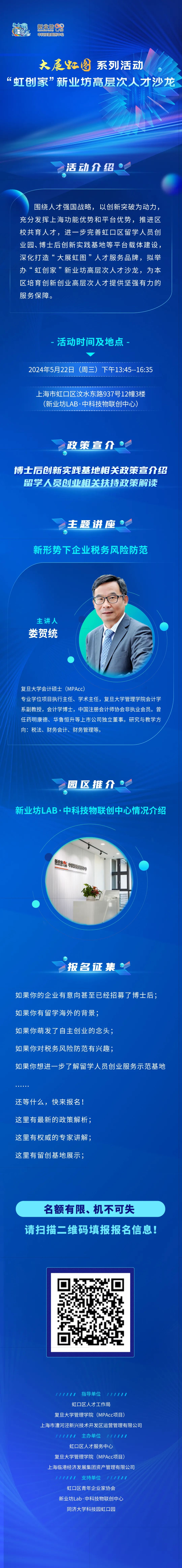 届时,除了将为虹口区高层次人才发展指导专家颁发证书、为新业坊LAB·中科技物联创中心揭牌虹口区留学人员服务示范基地外,还将举行相关政策解读、主题讲座和园区介绍。感兴趣的各类人才,赶快报名参与吧!详见↓