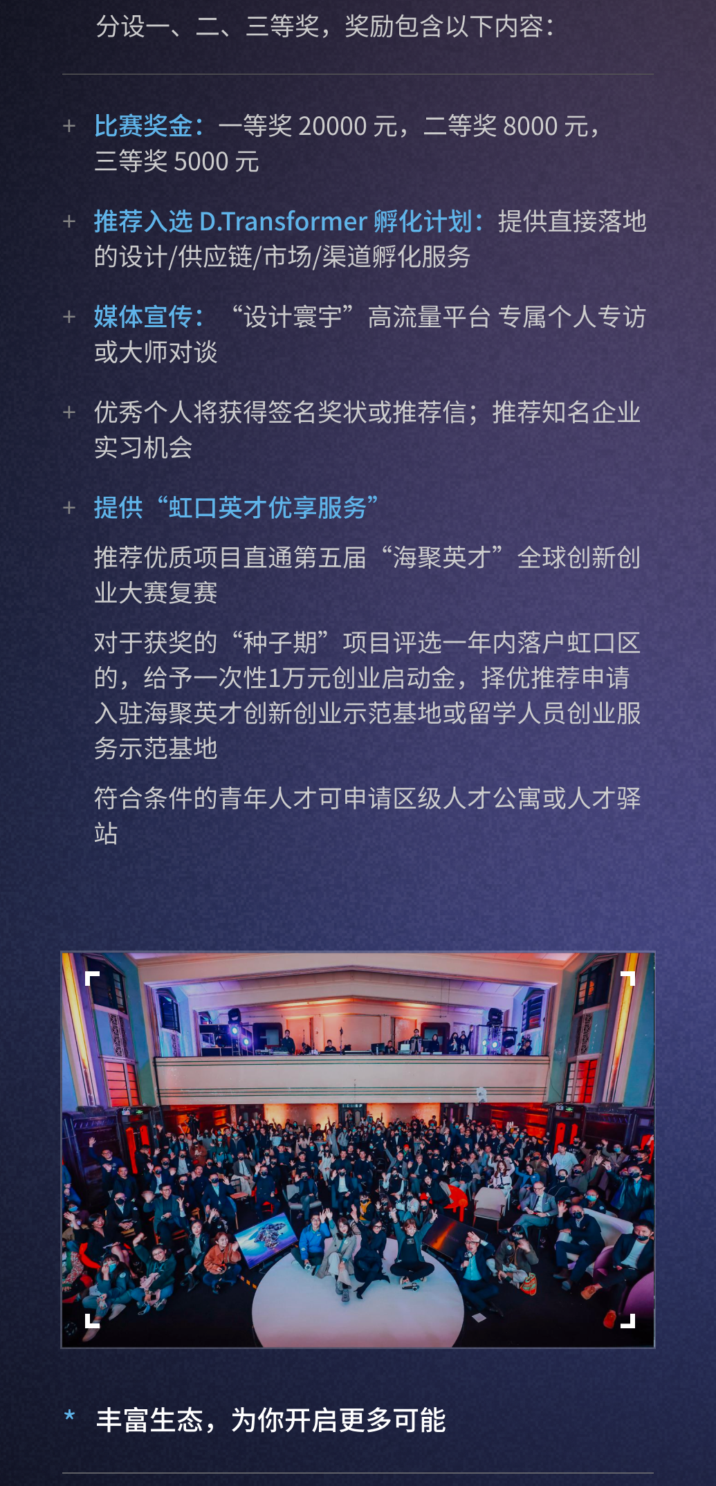 获奖项目最高将获20000元奖励,并推荐入选 D.Transformer 孵化计划,提供“虹口英才优享服务”。详见↓